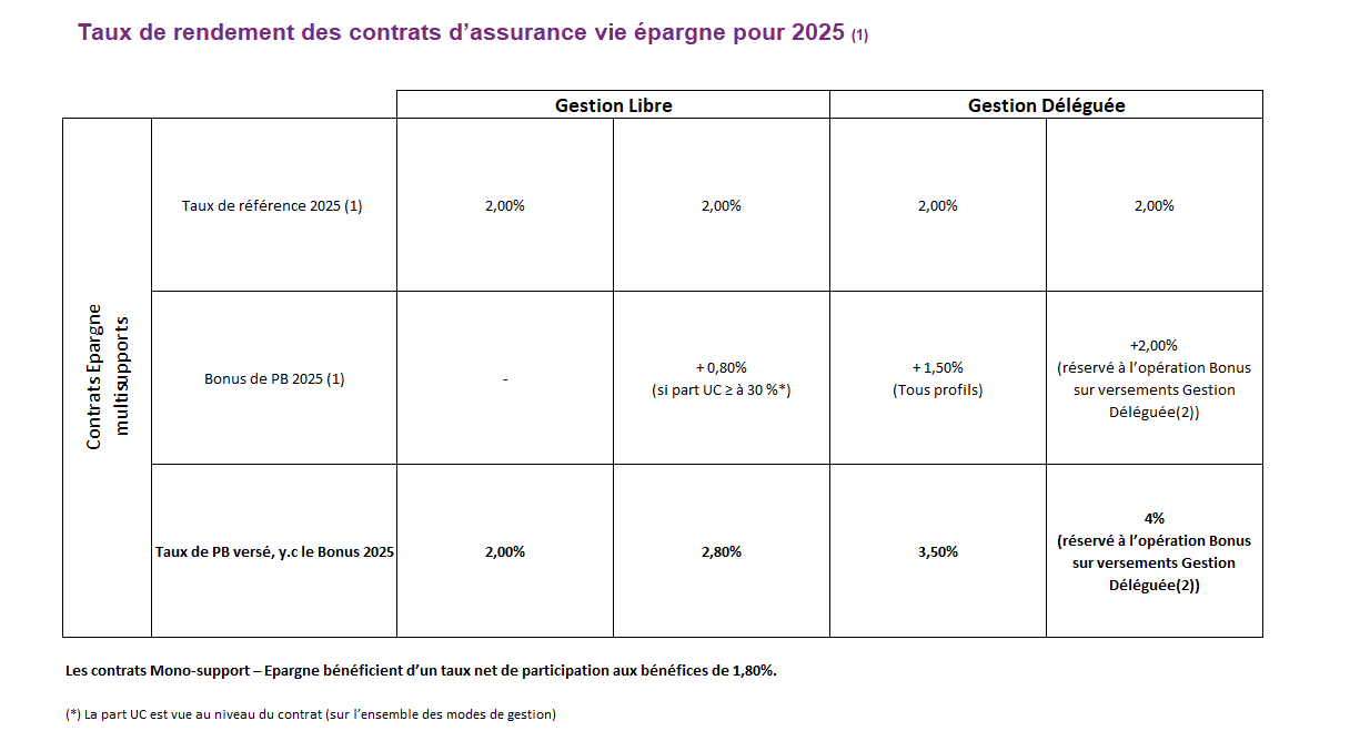 Grâce au dispositif de bonus, le taux de rendement maximum du fonds en euros des contrats d’assurance vie multisupports pour 2025 a atteint 4,00 % (participation aux bénéfices 2024 + Bonus 2025(3)). Le Bonus 2025 est attribué (sous réserve du respect de certains critères) en complément du taux de participation aux bénéfices distribué sur le fonds en euros au 31 décembre 2025, net de frais de gestion.